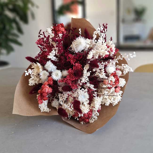The arrangement features a carefully curated selection of dried and preserved flowers such as everlasting flowers, gypsophila, burgundy-toned lagurus, and delicate white accents that bring balance and brightness. The result is a bouquet with presence, texture, and a contemporary feel that never goes unnoticed.