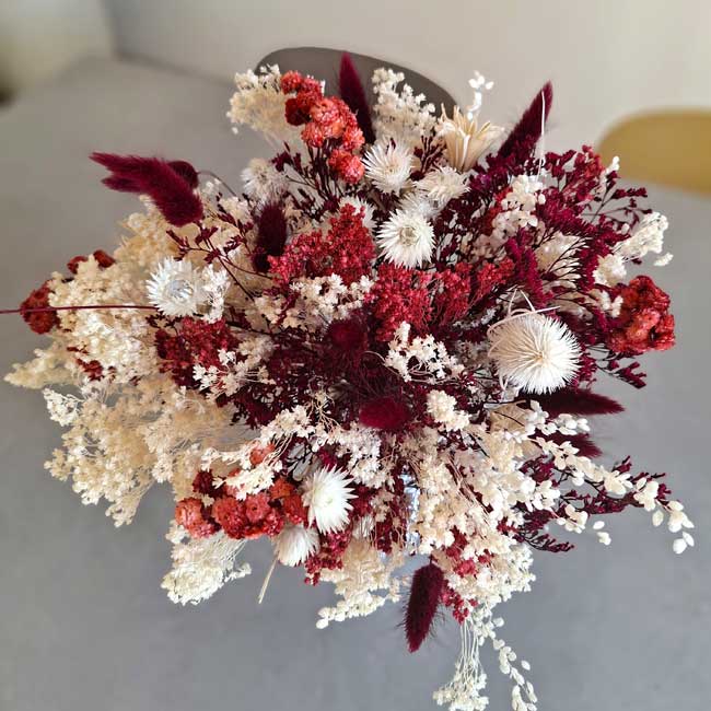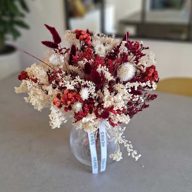 This sophisticated dried flower bouquet in deep red and white tones is a perfect blend of character, elegance, and warmth. Handcrafted by Herbs Barcelona, it stands out for its striking color contrast and natural style, ideal for those looking to add personality to their décor.