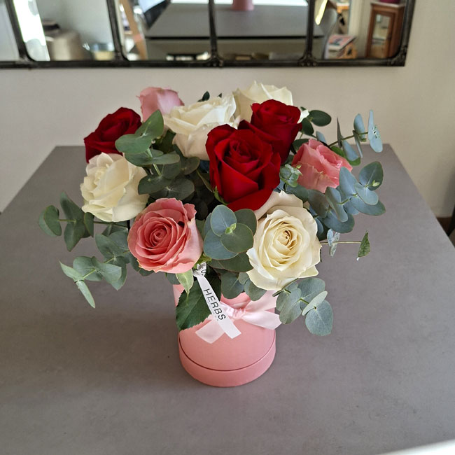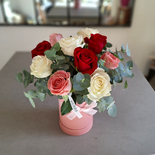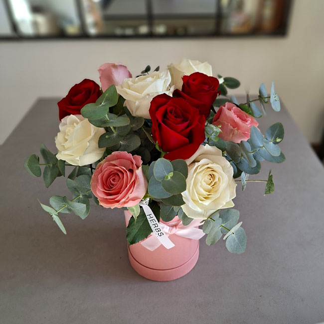 This elegant bouquet combines the delicacy of white roses, the passion of red roses, and the sweetness of pink roses, creating a perfect harmony that conveys love, tenderness, and elegance. Accompanied by natural eucalyptus foliage and presented in a delicate pink box with a ribbon, it’s the perfect gift to surprise someone special.