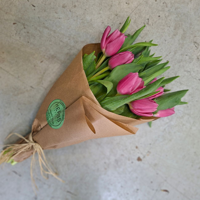 Includes: 10 premium pink tulips, hand-tied with natural wrap.