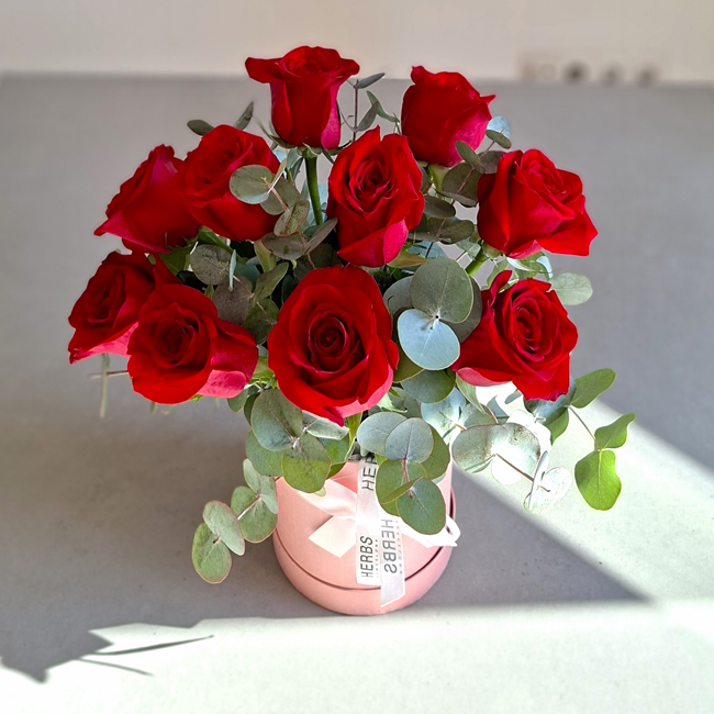Nothing expresses love and passion like red roses. Our Red Rose Box combines the timeless elegance of premium roses with the freshness of natural eucalyptus, creating a sophisticated and fragrant arrangement.