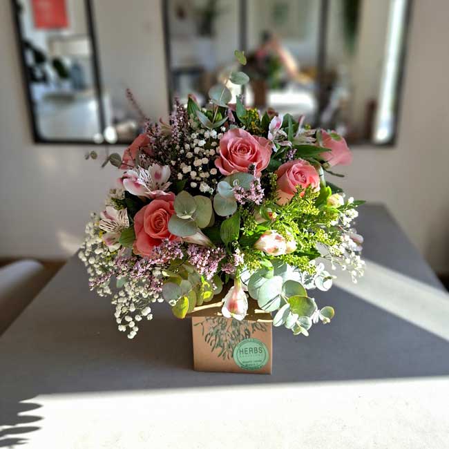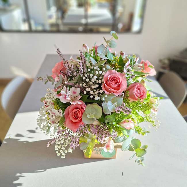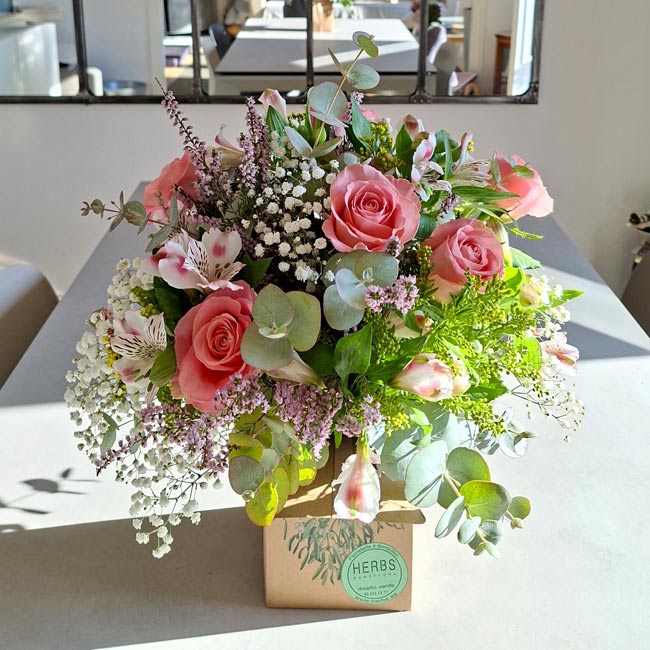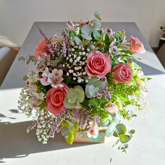 Beautiful flowers bouquet in a water box, consisting of 5 pastel-colored roses, solidago, wax flower, alstomelias, eucalyptus and leaves.