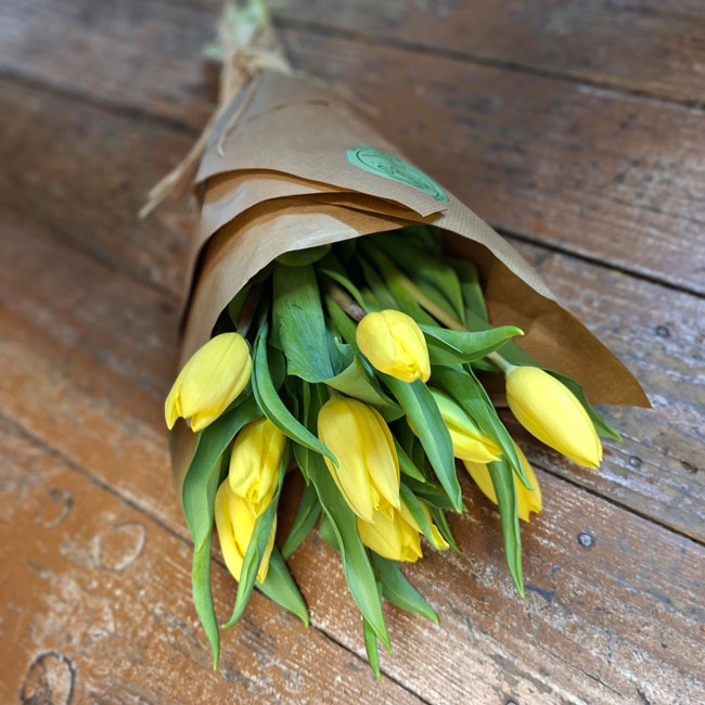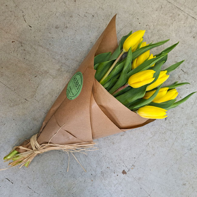Includes: 10 premium yellow tulips, hand-tied with natural wrap.